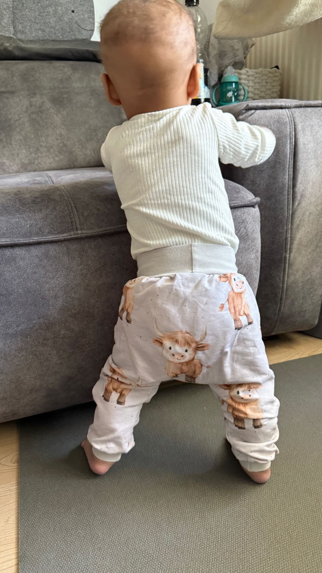 ..süße Pumphose mit passenden Bündchenstoff. Dank großzügig gewählter Bündchen wächst diese Hose über mindestens eine Größe mit.