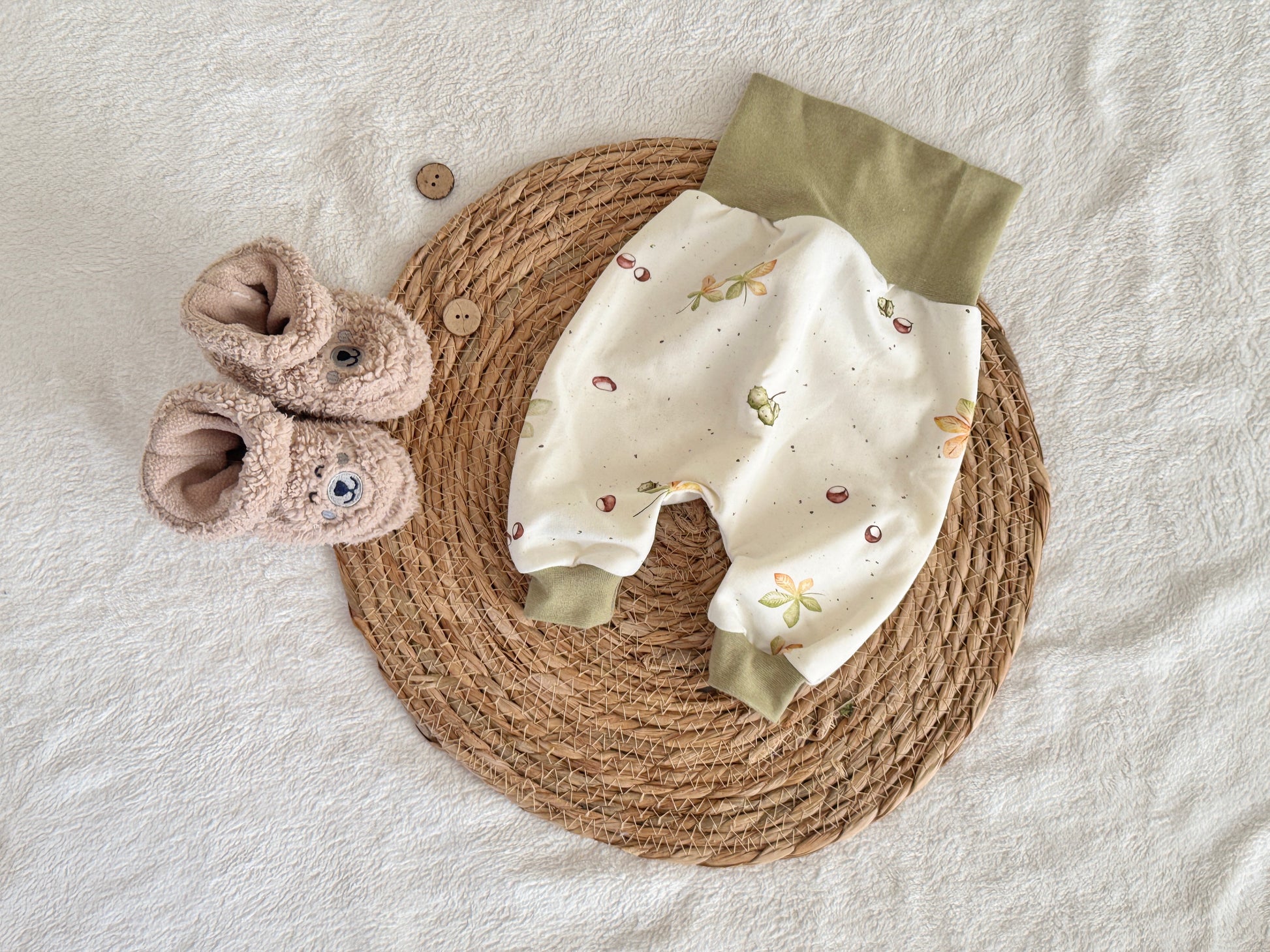 ..süße Pumphose mit passenden Bündchenstoff. Dank großzügig gewählter Bündchen wächst diese Hose über mindestens eine Größe mit.