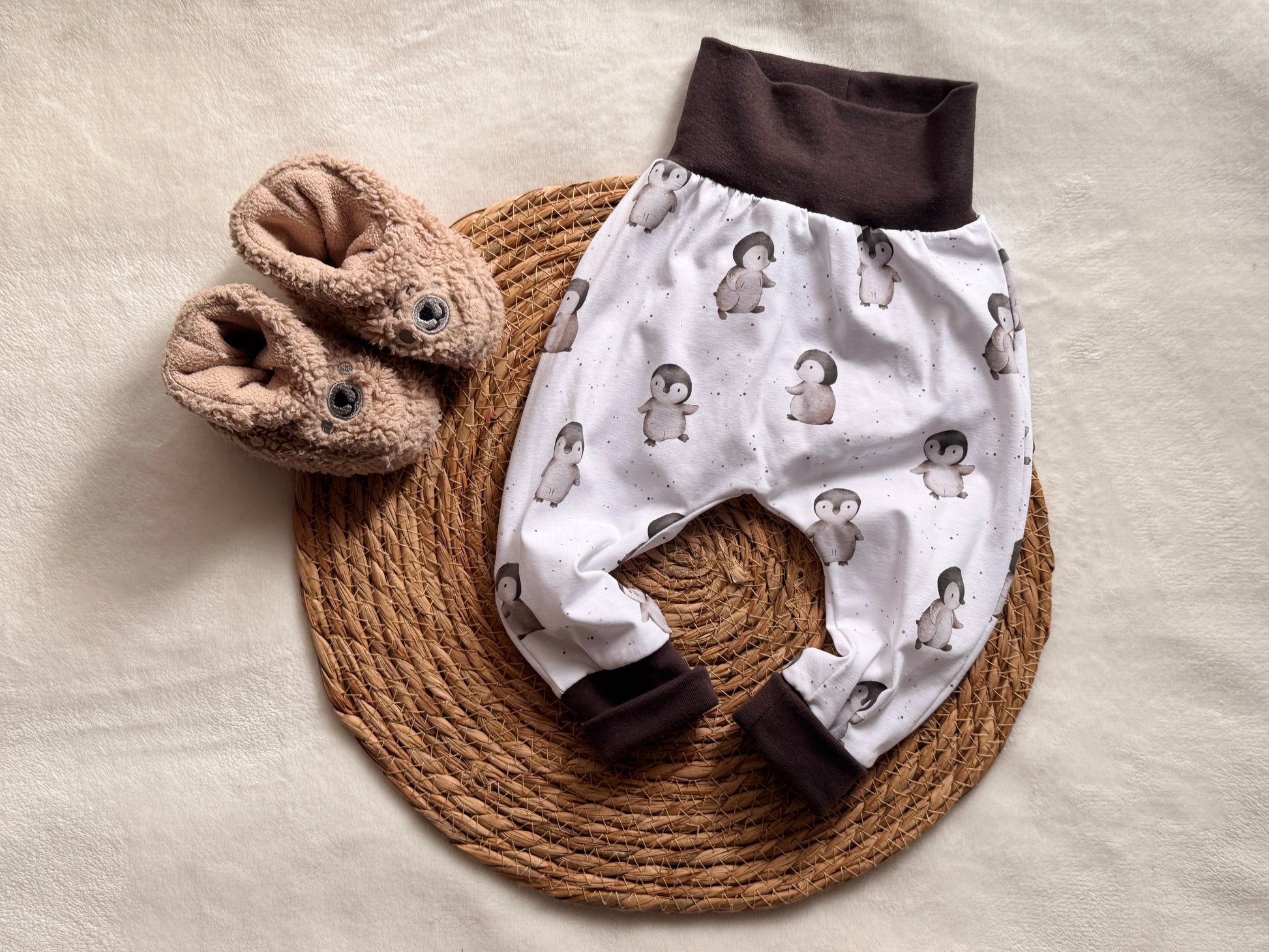 ..süße Pumphose mit Pinguinstoff und passendem Bündchenstoff. Dank großzügig gewählter Bündchen wächst diese Hose über mindestens eine Größe mit.