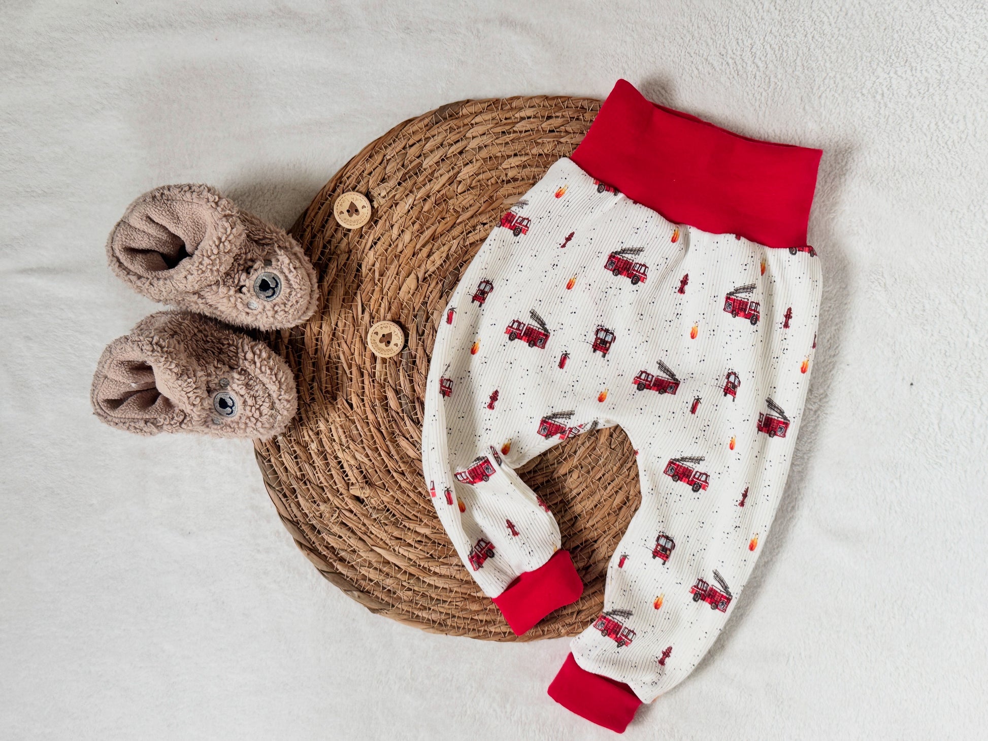 ..süße Pumphose mit Feuerwehrmotiv und passendem Bündchenstoff. Dank großzügig gewählter Bündchen wächst diese Hose über mindestens eine Größe mit.