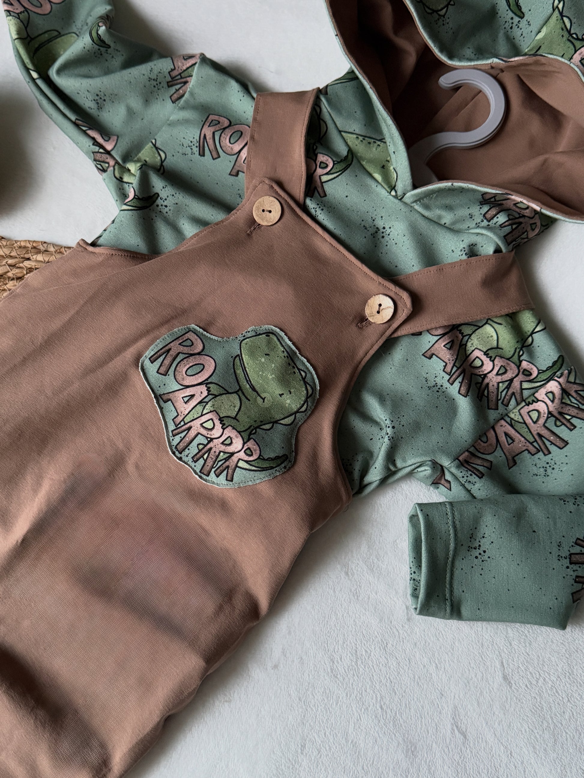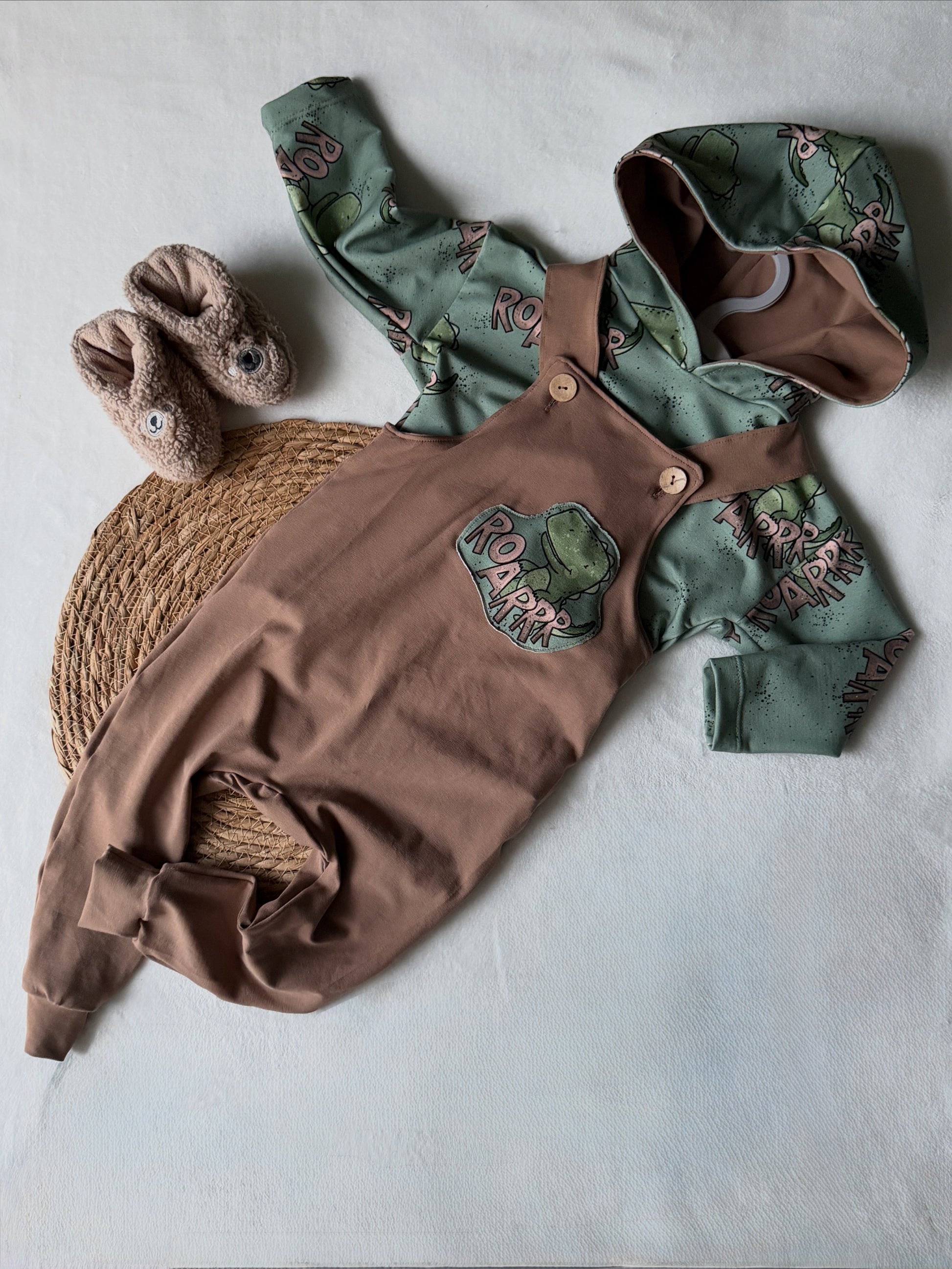 das Kapuzenshirt ist auf einem French Terry (95% Baumwolle; 5% Elastan) und die Latzhose aus einem Jersey (95% Baumwolle; 5% Elastan)