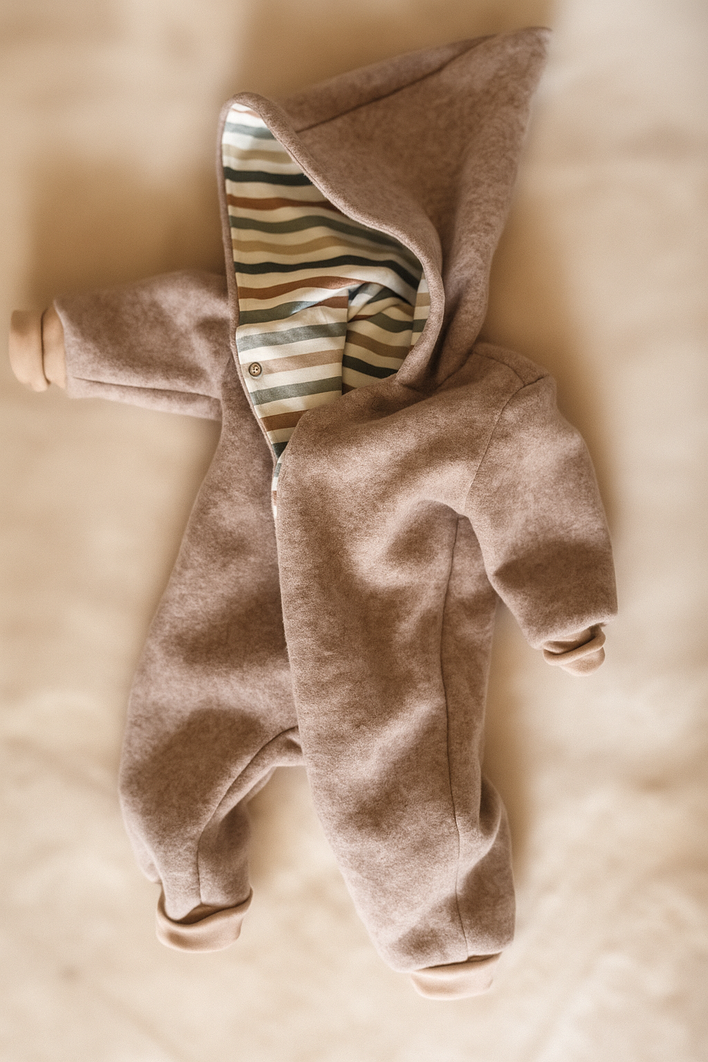 Walkanzug aus 100% Wolle, das Außenfutter besteht aus Schurwolle, das Innenfutter aus einem, passend zum Außenfutter, gewählten Baumwolljersey oder einem Musterstoff deiner Wahl.